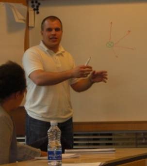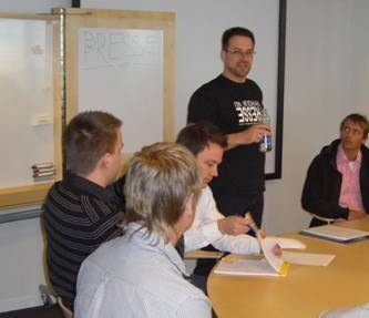 Brian Brandt (hov, det er jo mig ;-)) holdte en workshop om hvad en god idé er, hvordan du kan fremtvinge den og hvordan du kan realisere den i form af en prototype. Det gik meget på brainstorm metoder, hvordan du bruger den og til hvad. Først skal du erkende hvilket problem du gerne vil løse. Dernæst laver du en simpel brainstorm, hvor du starter med ordet i midten, og så sætter en streg ud til et ord du associerer med det ord du lige har skrevet i midten. Dette skaber en masse billeder i dit hoved, og på skrift, hvilket avler nye tanker. På et tidspunkt ender du op med en god ide til hvordan du kan løse dit problem.